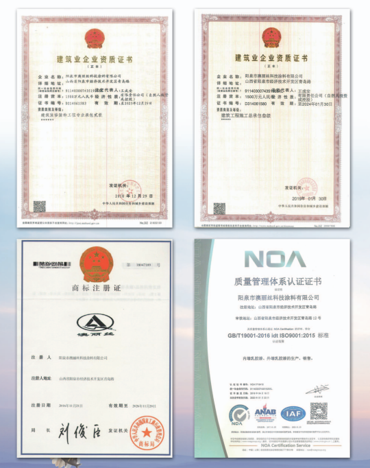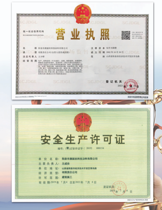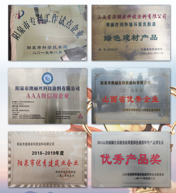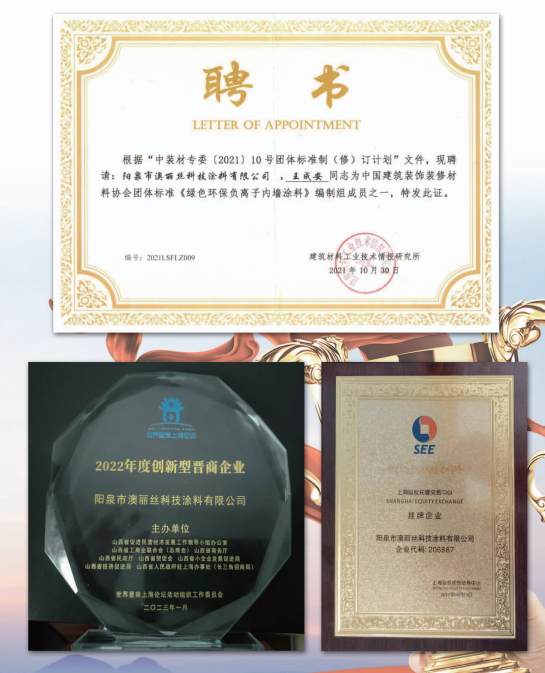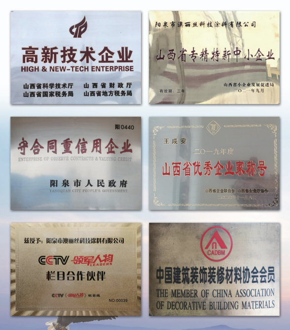 陽(yáng)泉市澳麗絲科技涂料有限公司本著“建標(biāo)準(zhǔn)化管理體系、帶高標(biāo)準(zhǔn)團(tuán)隊(duì)、打造民族品牌”的目標(biāo),公司規(guī)模不斷擴(kuò)大,現(xiàn)已擁有高級(jí)管理人員16人,高級(jí)工程師8人,科研人員9人,工程項(xiàng)目經(jīng)理5人,員工260人,是一支技術(shù)力量雄厚的年輕團(tuán)隊(duì)。公司先后獲得山西省“高新技術(shù)企業(yè)”、“專(zhuān)精特新中小企業(yè)”、榮獲“AAA信用企業(yè)”、“山西省優(yōu)秀企業(yè)”、“山西省著名商標(biāo)”、山西省建設(shè)廳頒發(fā)的“優(yōu)秀產(chǎn)品獎(jiǎng)”、山西省民營(yíng)經(jīng)濟(jì)促進(jìn)會(huì)副會(huì)長(zhǎng)單位、陽(yáng)泉市人民政府頒發(fā)的“重合同守信用企業(yè)”、“陽(yáng)泉市優(yōu)秀建筑企業(yè)”、“陽(yáng)泉市企業(yè)聯(lián)合會(huì)、陽(yáng)泉市企業(yè)家協(xié)會(huì)、陽(yáng)泉市工業(yè)經(jīng)濟(jì)聯(lián)合會(huì)副會(huì)長(zhǎng)單位”,并于2023年1月獲得了由山西省促進(jìn)民營(yíng)經(jīng)濟(jì)發(fā)展工作組、山西省工商業(yè)聯(lián)合會(huì)、山西省商務(wù)廳、山西省民政廳、山西省貿(mào)促會(huì)、山西省小企業(yè)發(fā)展促進(jìn)局、山西省投資促進(jìn)局、山西省人民政府駐上海辦事處聯(lián)合主辦的世界晉商上海論壇活動(dòng)組織工作委員會(huì)頒發(fā)的“2022年度創(chuàng)新型晉商企業(yè)”等多項(xiàng)榮譽(yù)。
